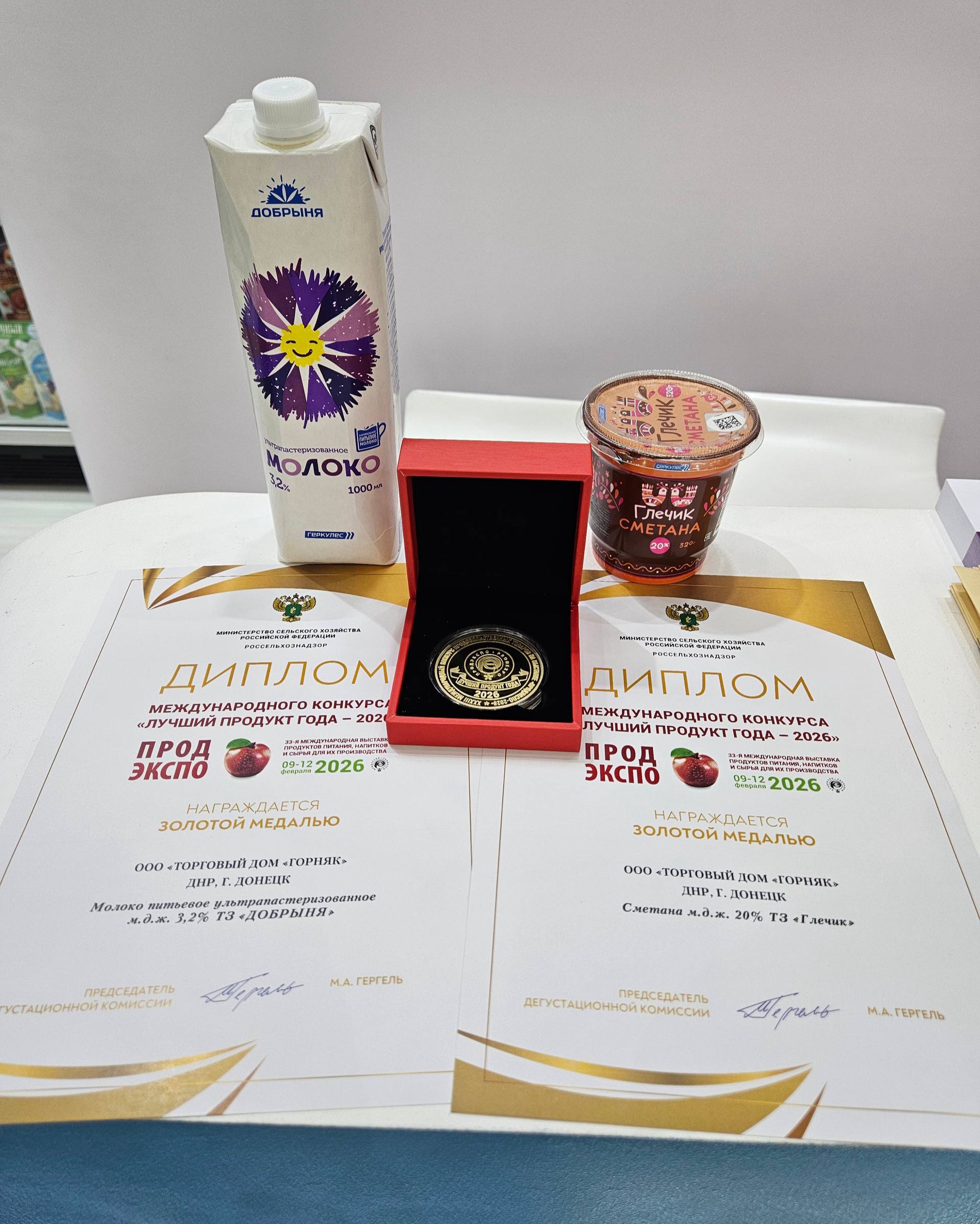 ️В заключительный день международной выставки «Продэкспо-2026» предприятия Донецкой Народной Республики продемонстрировали высокий уровень качества продукции и конкурентоспособность на федеральной площадке.Ультрапастеризованное молоко «Добрыня» и сметана «Глечик», представленные ООО «ТД «ГОРНЯК» (подразделение Гормолокозавод №2), получили золотые медали в престижной категории «Продукт года 2026», а также были отмечены дипломами выставки.